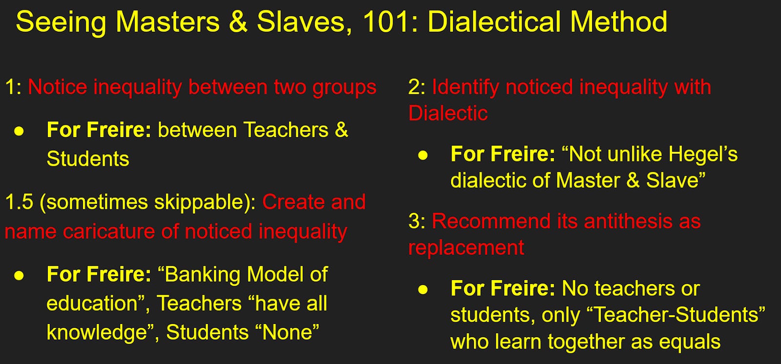 Step 2: Identify the named state of inequality as an expression of the Master-slave-dialectic or some variation of it. Freire made this easy for us by explicitly invoking Hegel’s dialectic, but nothing prevents analysis from doing it indirectly by invoking a concept developed with reference to the dialectic, like Marx’s capital. If we were to do this for Freire, we could describe the possession of knowledge as capital in this situation, owned by the teachers and rented out to the students, who lack the ability to capitalize on it.