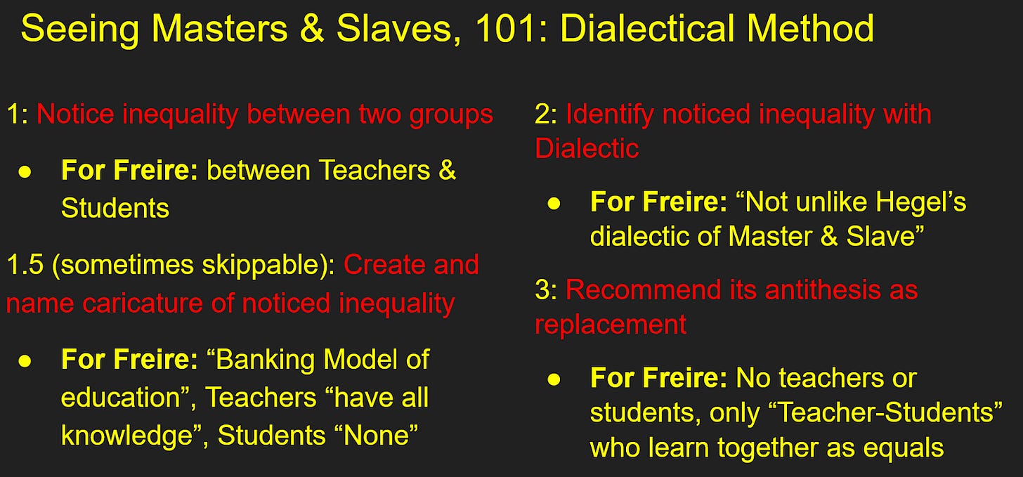You might think I am arguing against a straw-man here, that nobody actually believes the dialectic is as real as or more real than anything else. Certainly, few would proclaim that as their faith, but it is my estimate from years of study and observation that you need to assume that various left-wing philosophers hold this faith in order for many of their arguments to make sense. Moreover, while I stress that I have not myself read Hegel, this faith as such does seem to be Hegel’s major contribution to philosophy, and is required for the mere friction between theory and practice to lead where it is thought to by historicists. I find Freire to be among the most clear in this faith, since he basically outright states that the reasoning behind his project is based on how a relationship resembles the Master-Slave Dialectic from Hegel in Pedagogy of the Oppressed’s chapter 2. With that Freire provides an example of how straightforwardly the Master-slave-dialectic can be applied, with an implied correctness that made my mere objection in class fascinate a lecturer who was a fan of Freire’s work. Let me use Freire as a reference point to show you how simple this can be.