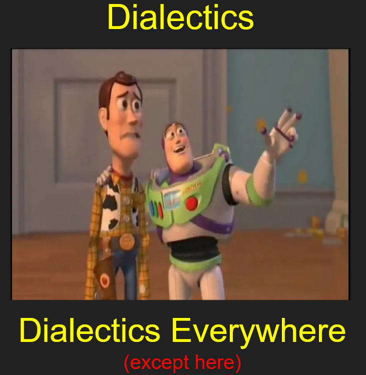 There is a good case for the dialectic as an aid in structuring thoughts. Even though I think a lot of things are like the dialectic in some ways, I do not think the dialectic is one thing in any meaningful sense. Instead I think that seeing it as one thing is a mistake. It is a fine tool in the toolkit to help us make sense of the world, but applying dialectics to everything makes no sense at all.