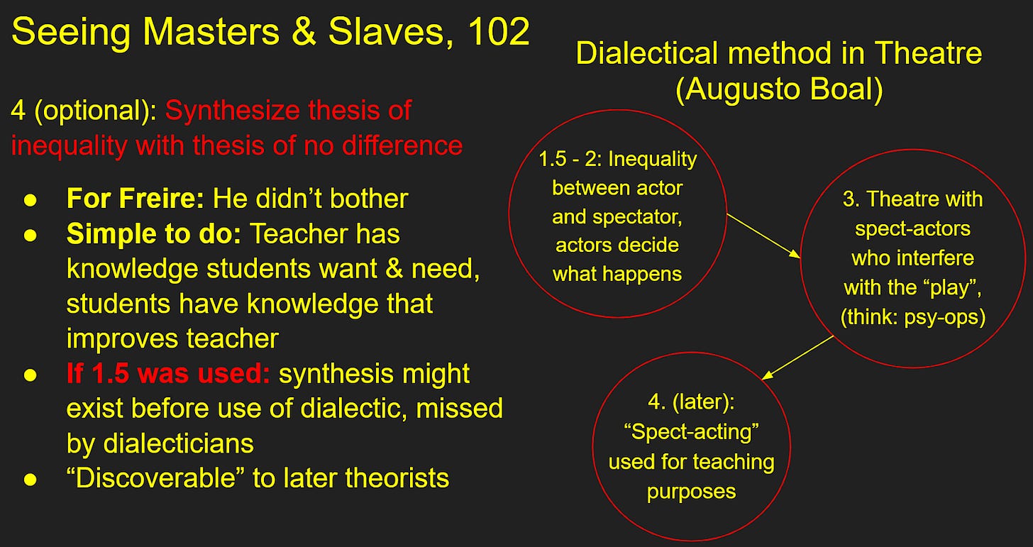 Step 4, which is optional: Attempt to synthesize the thesis of inequality with the antithesis of no difference. Freire did not really do this for teacher-students, presumably because he was looking for a synthesis on a different level, but it is fairly simple: Teachers have some knowledge which the students want, and students have some knowledge that could help the teachers improve. In the event that step 1.5 produced a caricature, step 4 might already be in existence where the dialectic is applied, in which case dialecticians are bound to miss it. If step 4 was not done by the person applying the method, it is likely present in the later theorists who drew on the former.