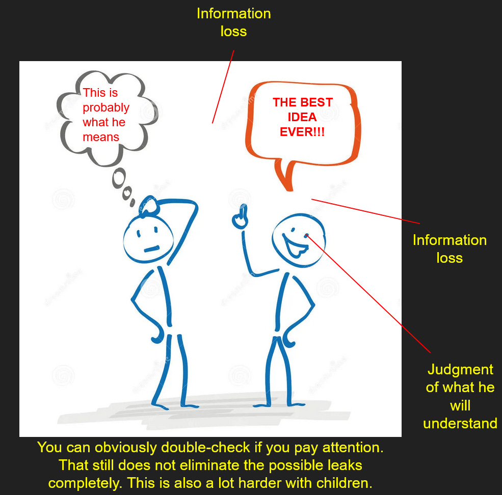Now imagine that you try to communicate an idea to me. You have a rough idea of what you want to say, and a rough idea of what I understand already, so if you have any sense, you will try to use what I already understand to explain it to me. You will also be taking an idea from your mind, translating it into words you think are appropriate and which I will understand, and offering that to me. If I pay attention, which I don’t have to do, I can probably recreate the idea in my head from your output, with some minor variations from edge meanings of words that have slipped us by, and maybe a connection to something I know of which you don’t. This is to say there is likely going to be an information leak even when I pay close attention and you do a good job, where I fill in the blanks and might do so incorrectly. This is basically the same as genetic mutation, but probably more frequent. Now add in the possibility that I might not be paying that much attention. That would mean more blanks to fill in. Now factor in that every new generation brings new minds that need to have the brilliant ideas inserted into them for the harmony to continue. At scale and over time, the information leaks make that essentially impossible.