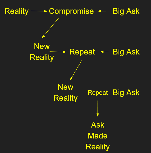 3: A big ask. In finance and politics you will sometimes hear of this trick, in which you, trying to get what you want out of a deal, ask for way more than you could possibly expect to get. This sets the stage for haggling, in which a compromise is eventually reached. Since your starting position was so out-of-this-world, any compromise reached is going to bring reality closer to your big ask, in a way that is easily illustrated as a synthesis. If done repeatedly, with the same big ask, it might not even look as outlandish by the end. Here, synthesis means changing reality according to a theory, that is, the opposite of the first example.