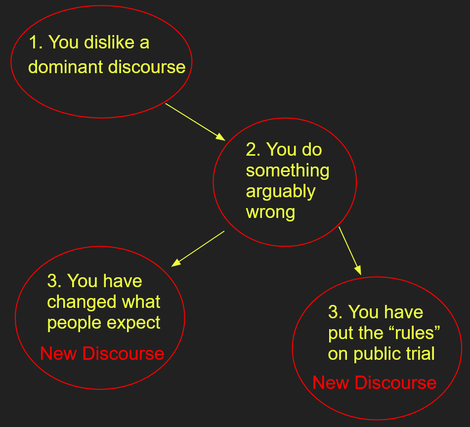 Postmodern Praxis is sometimes simply explained as play. Instead of following the rules of the surrounding discourses, the postmodernist tries to do things simply to see if it can be done, to test the powers in play. This might take the form of experimenting with non-conventional sexual activities. It might take the form of doing something that is normal in one setting in another situation. It is basically a form of resistance against doing what the postmodernist perceives that he is being told or encouraged to do, demonstrated by trying to do something that he perceives that the system is discouraging him from doing. Thus, it is often on the edges of what you might find acceptable, and sometimes it might pass beyond the pale. For postmodern praxis, the purpose of this activity is to challenge and resist dominant discourses, to break down the rules that limit them, and allow for people to be and do whatever they want.