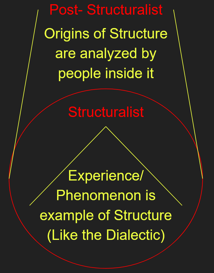 Let us start with structuralism. Structuralism sees the world in terms of structures. A structuralist analysis connects a phenomenon, or to echo Kant’s analysis of objective knowledge, a subjective experience, to a larger structure. In this way, it tries to say something meaningful about the phenomenon as an example. This can take many forms with many different kinds of structures and phenomena, and can be done both with the dialectic itself and with the products of a dialectic, like the social structures of the Master’s Hegemony. When Derrida applied the master-slave dialectic to word-pairs and concluded that word-pairs depended on each other, the structure of their relationship, for their meaning, that was a structuralist analysis. To get a bit meta, this series of videos is a structuralist analysis insofar as I have tried to connect all I know of left-wing philosophy to Hegel’s Dialectic.