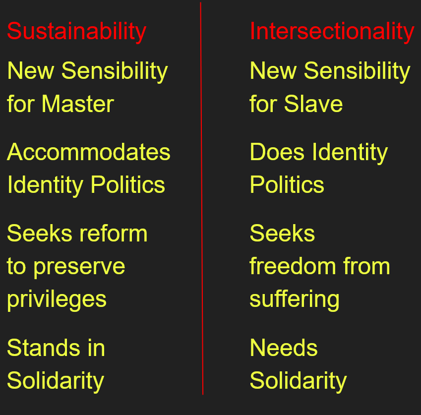 Insofar as there is a difference between these two attempts at a new sensibility, it is the difference between sustainability desiring reform to preserve good things in society, and intersectionality desiring revolution to remove bad things from society. We can understand Honnethian Critical Theory to lean towards sustainability, since it wants a state to protect people from misrecognition. The notions of privilege and false consciousness, for their part, pull more towards revolution, and are more central in the intersectional logic.