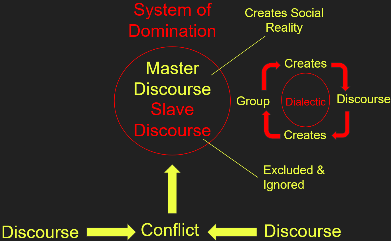 The power-structure and its discourses is Gramsci’s Hegemony by another name, but it applies to everything. It opened up an infinite number of angles for analysis through the master-slave-dialectic. By seeing the discourses as controlling who decides what is correct, what may be said about social formations, vast numbers of people can now be seen as excluded from discourses they did not understand and therefore also excluded from deciding what may be said, what power-structures can be produced. These in turn control the production of social reality, the world we share, by limiting what can be socially constructed.
