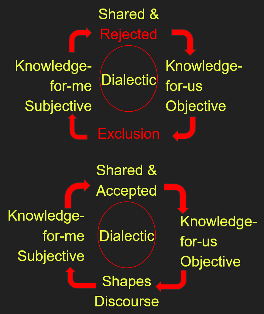 To defend against the postmodern impulse to deconstruct even these identities,Crenshaw effectively countered as follows: Those who are really oppressed don’t have the luxury to deconstruct the identities that oppress them. Formulated the other way around, if you can deconstruct these identities that is because of your privilege. Since you have privilege, you are part of the Master-subject in the exchange, and since you use your privileges to perpetuate and defend the oppression of the Other, you are basically a bad person. You are not engaged in Praxis as a good Master, a good ally. This moral condemnation had enough power to justify postmodern methods in the service of identity politics. We may also note that, if we follow Kant’s notion of objective knowledge and we accept the dialectic as synthetic a priori, as an assumption we can’t help but to make, this moral condemnation is objective knowledge.