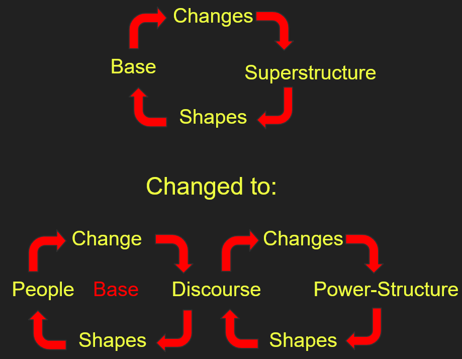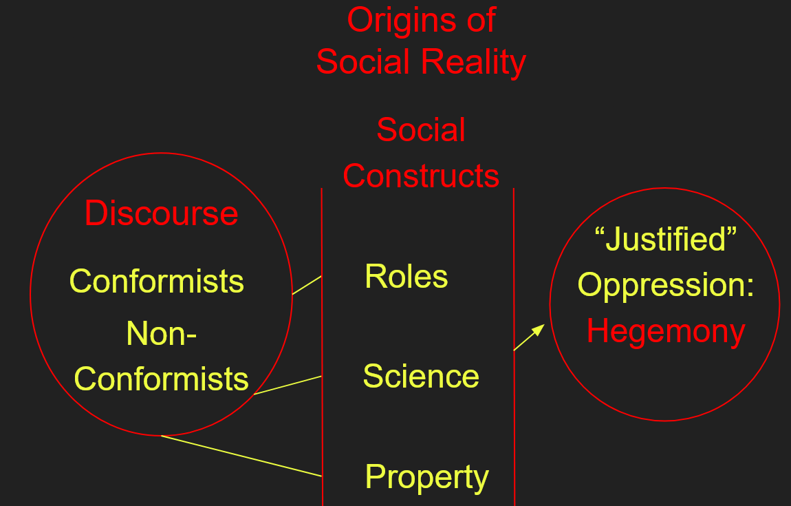 Putting it simply, in the analysis of post-structural postmodernists, the hegemony moved from the marxist model of a superstructure which justifies who has power to a power-structure that perpetuates itself. Marxists saw the superstructure in a dialectical relationship to what they called the base, which determined the form of the superstructure, and which together formed what they called the political economy. Postmodernists and marxists of the later 20th century adapted this model to new contexts, discussing things like the political economy of race, knowledge, sexuality, and so on. To Marxists, the base was usually conceived as available resources and the tools available to make use of them. To later iterations of marxian theory, the material resources were increasingly a side-issue, as culture and the means of cultural reproduction, like speech and action, took center-stage. Postmodernists often referred to these as discourses. The things discourses create are generally called social constructs.