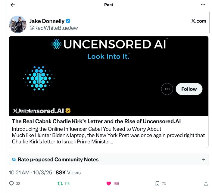 After my usual scroll — reading, replying, reposting — I shared a graphic and an article with two accounts: ConceptualJames and LauraLoomer. Both were dissecting the strange theater of the extreme right™. The graphic came straight from the article; I added it beneath LauraLoomer’s post because her replies were swarmed by bots, and under ConceptualJames because he’d shared the same piece the day before but missed that particular image.