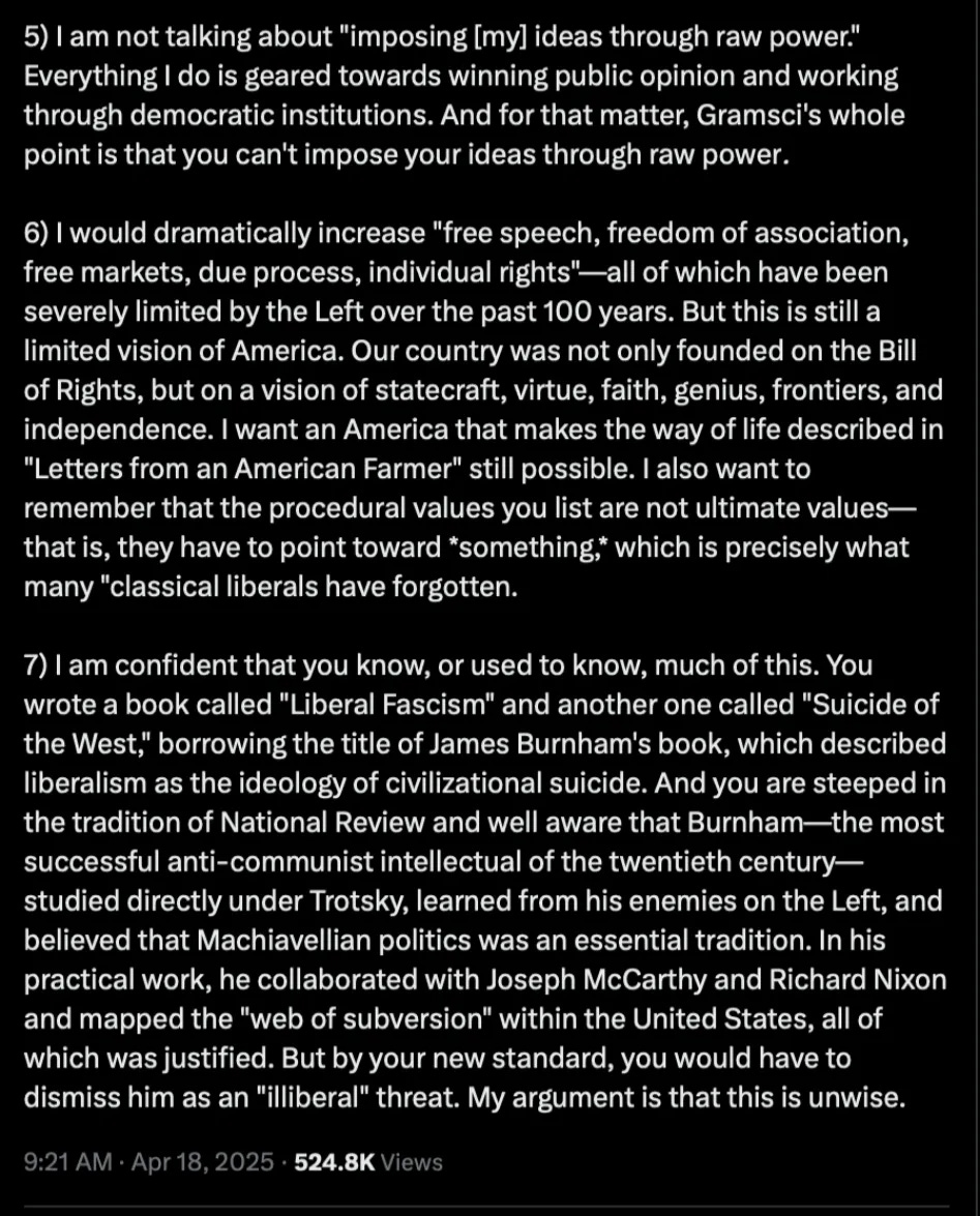 Ignore for the moment his use of "Gramsci". In his long quoted post, he says that he wants to persuade the people, not use raw power. That sounds like something who honors the representative republic would do. In other words, it sounds like his entire post is "using power for good isn't evil". Rufo isn't woke, he doesn't appear to believe in any of his writings that good/evil are just social constructions but he appears to believe in consequential reality. So he appears to be saying: "Let's look at reality, determine what is good, convince the people that this is good, and if they elect us, use power to get it done." Now, I could be wrong in this interpretation. But if correct, this sounds like entirely inline with the US constitution.